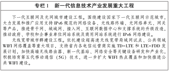 1.推进高速光纤网络建设。全面向全光网络跨越,加快推进城镇地区光网覆盖,提供每秒1000Mbps(兆比特)以上接入服务,大中城市家庭用户实现宽带100Mbps以上灵活选择;多方协同推动提升农村光纤宽带覆盖率,引导电信运营企业在全省所有行政村建立通信机房和光缆接入节点,确保98%以上的行政村实现光纤通达,农村光纤由行政村向自然村拓展。推动三网融合基础设施建设。