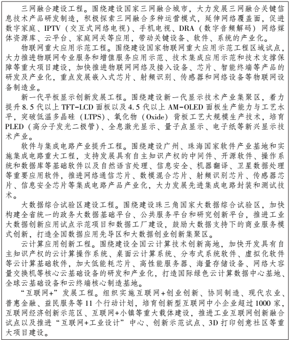 3.提升整机产品与核心基础软硬件竞争力。面向下一代网络、云计算、工业互联网等新技术与应用体系,集中推进计算、存储、网络、终端等关键整机产品发展,鼓励电子信息产业整机企业向产业链上游发展。围绕移动智能终端、数字家庭、新一代智能卡、现代工业控制、信息安全等重点领域,加快推进集成电路设计产业做大做强,逐步补齐集成电路产业制造、封装环节短板;重点发展广东优势制造行业的工业核心软件,以及文化、教育、金融、电子政务、医疗等领域的应用软件。以片式化、微型化、集成化、高性能化为目标,加快电子基础元器件和关键材料的改造升级。加快推动量子点、柔性、超高清(4K及以上)、印刷、激光、3D等显示技术研发和产业化。加快推动新型平板显示、半导体照明、电力电子等领域核心装备与关键材料的规模化生产与应用。