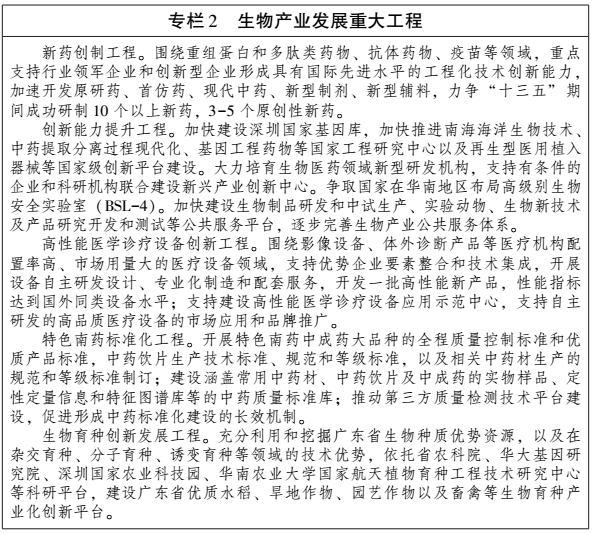 1.促进生物医药创新发展。把握精准医学发展趋势,大力发展高通量测序、基因编辑、基因合成、细胞治疗等先进技术。针对糖尿病、病毒性肝炎、肿瘤、自身免疫性疾病等重大疾病,积极发展免疫原性低、稳定性好、靶向性强、长效、生物利用度高的重组蛋白药物和抗体药物。大力发展治疗性疫苗、重组疫苗等新型疫苗,推进部分免疫规划疫苗的升级换代。支持干细胞与再生医学领域关键技术研发和临床试验。加快临床急需的专利到期药物仿制,推进仿制药一致性评价。大力发展具有自主知识产权的原创中药新品种,推进名优中成药二次开发,做强特色南药,加快推进中药标准化。加大海洋生物技术产品、创新药物研发力度。