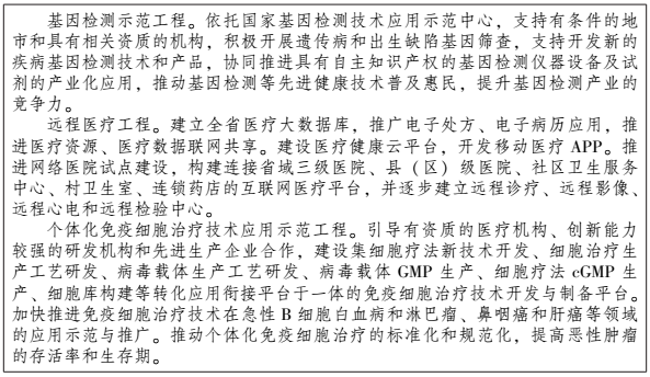 2.提升生物医学工程发展水平。充分运用大数据、云计算、物联网等新一代信息技术,发展符合网络化、数字化、移动化趋势的新兴医疗设备。重点发展光子、质子、重离子等高端治疗装置,以及医学影像设备、先进放射治疗设备、高通量基因测序仪、基因编辑设备、康复类医疗器械等医学设备。针对临床治疗需求,推进增材制造(3D打印)技术等新技术的应用,继续加快组织器官修复和替代材料及植(介)入医疗器械产品创新和产业化,加速仿生医学、再生医学和组织工程技术发展。针对重大传染性疾病检测需求,加速发展体外诊断仪器、设备、试剂等新产品,推动高特异性分子诊断、生物芯片等新技术发展。