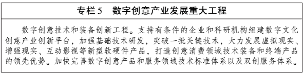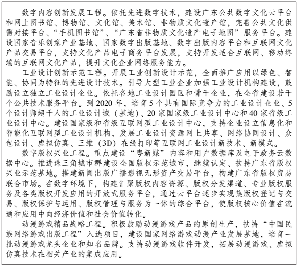 1.大力发展数字文化创意产业。适应沉浸式体验、智能互动等趋势,加强内容和技术装备协同创新。加快虚拟现实、增强现实、全息成像、裸眼三维图形显示(裸眼3D)、交互娱乐引擎开发、文化资源数字化处理、互动影视等核心技术创新发展,加强大数据、物联网、人工智能等技术在数字文化创意创作生产领域的应用。研发具有自主知识产权的超感影院、混合现实娱乐、广播影视融合媒体制播等配套装备和平台,开拓消费新领域。充分挖掘岭南优秀文化资源,激发文化创意,适应互联网传播特点,创作优质、多样、个性化的数字创意内容产品。鼓励对艺术品、文化、非物质文化遗产等文化资源进行数字化转化和开发,促进优秀文化资源创造性转化。