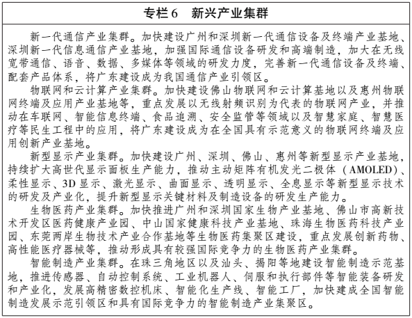 集聚效应不断显现。推进15家国家高技术产业基地和42家省战略性新兴产业基地建设,发展形成新一代移动通信、平板显示、高端软件、半导体照明、生物医药、智能制造装备、新材料等产值规模超千亿元的新兴产业集群,珠三角地区获批成为国家首批战略性新兴产业区域集聚发展试点。移动智能终端、基因检测、新能源汽车等产业在全国占有重要地位。